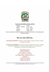 TREE-GUYS Pizza Pub will put a smile on your face, pizza in your mouth and a beer in your hand! Whether you are a regular or visiting us for the first time, you are always welcome and appreciated! We are a restaurant and a bar (separate). So, whether you are looking for a tradition restaurant serving some of the best pizza and Italian/American food in the Suburban area; or an upbeat local bar atmosphere, with over 15 tvs and 6 gambling machines; we are your place. We have an outdoor patio connected to our restaurant which is open during the Spring and Summer seasons. Unwind after work, cheer on your sports team, enjoy good drinks, nice conversation, great food, and amazing daily specials. *Full-service bar and full menu are available on either side.